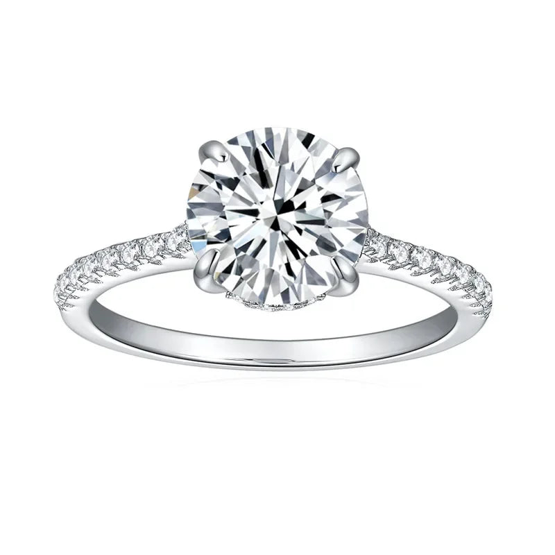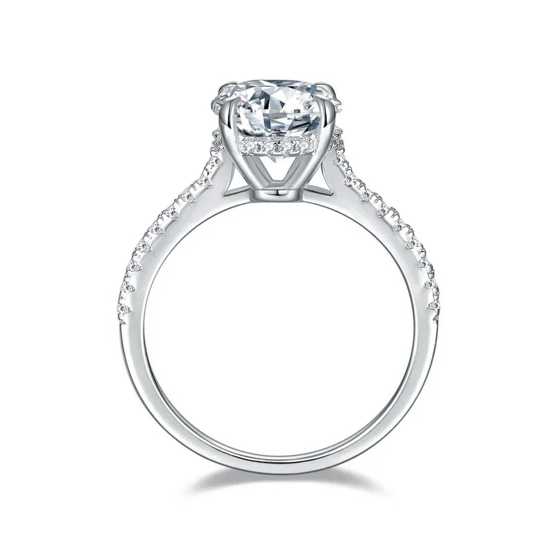 טבעת סוליטר יוקרתית עם אבן מוסונייט עגולה ומבריקה בעיצוב נקי, קלאסי ועל-זמני.
