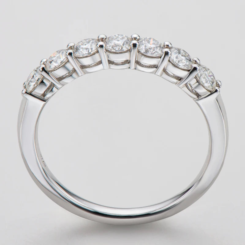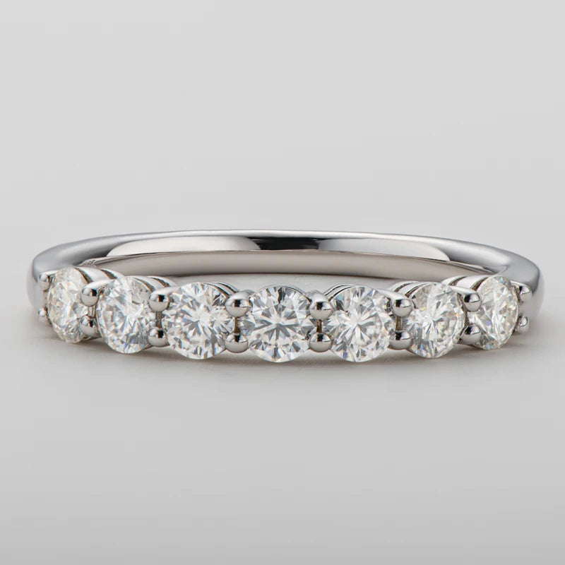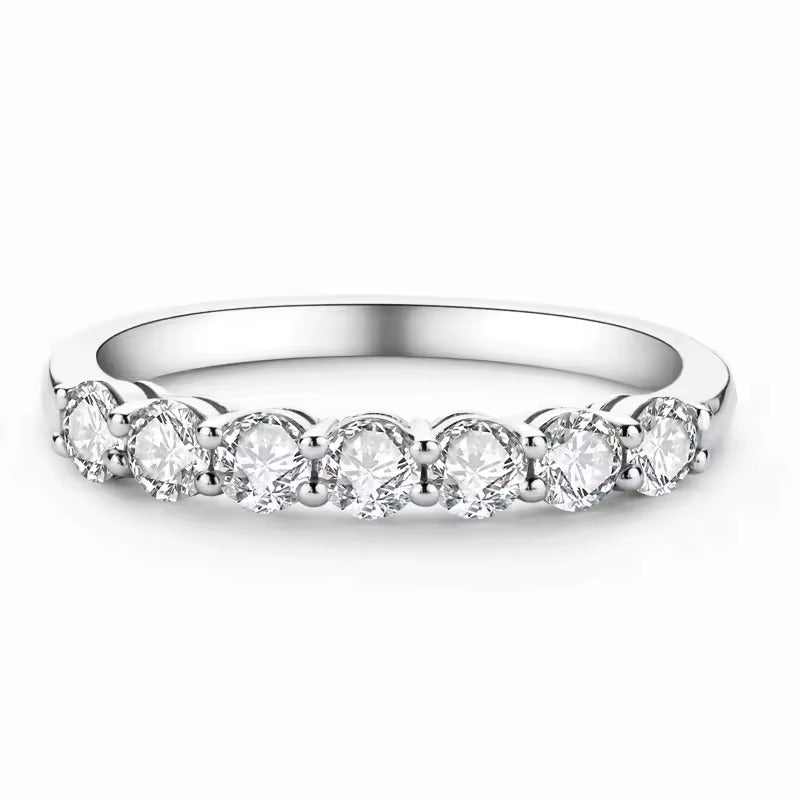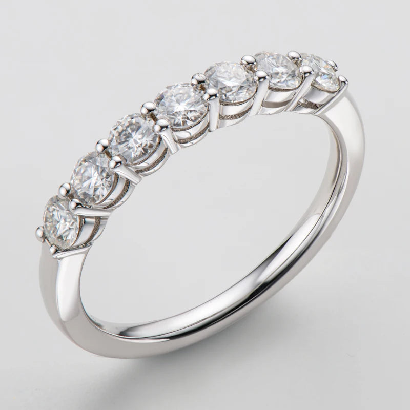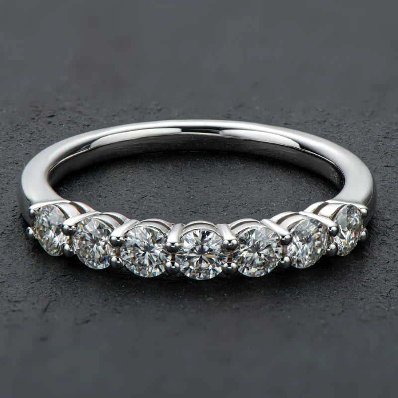 טבעת עדינה, נקייה ויוקרתית המשובצת בשבע אבני מוסונייט מבריקות בגודל 3 מ״מ כל אחת.