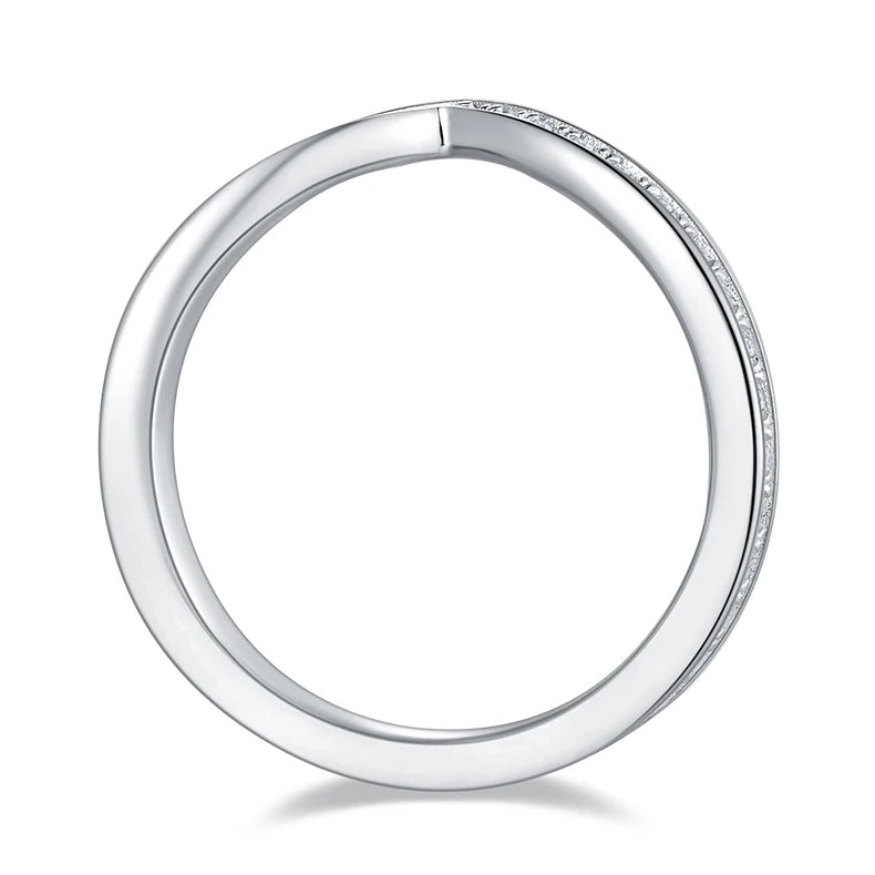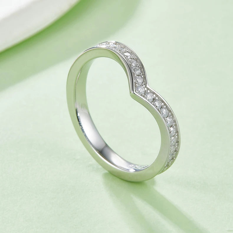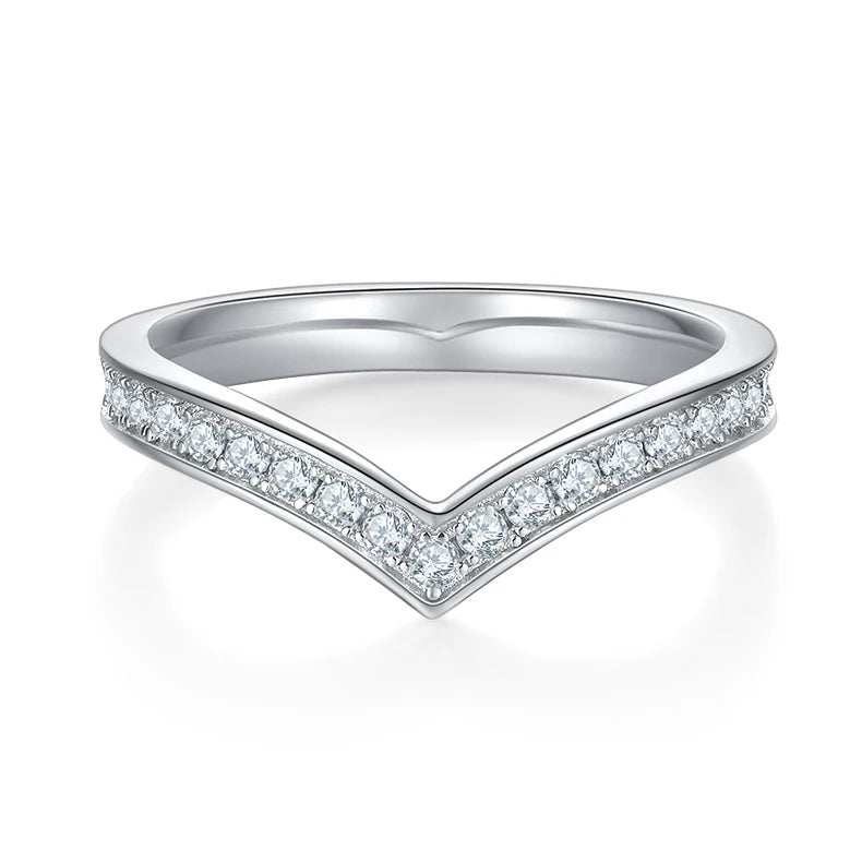 טבעת דקה ועדינה בעיצוב V נקי, משובצת בשורה של אבני מוסונייט מבריקות בגודל 1.5 מ״מ.