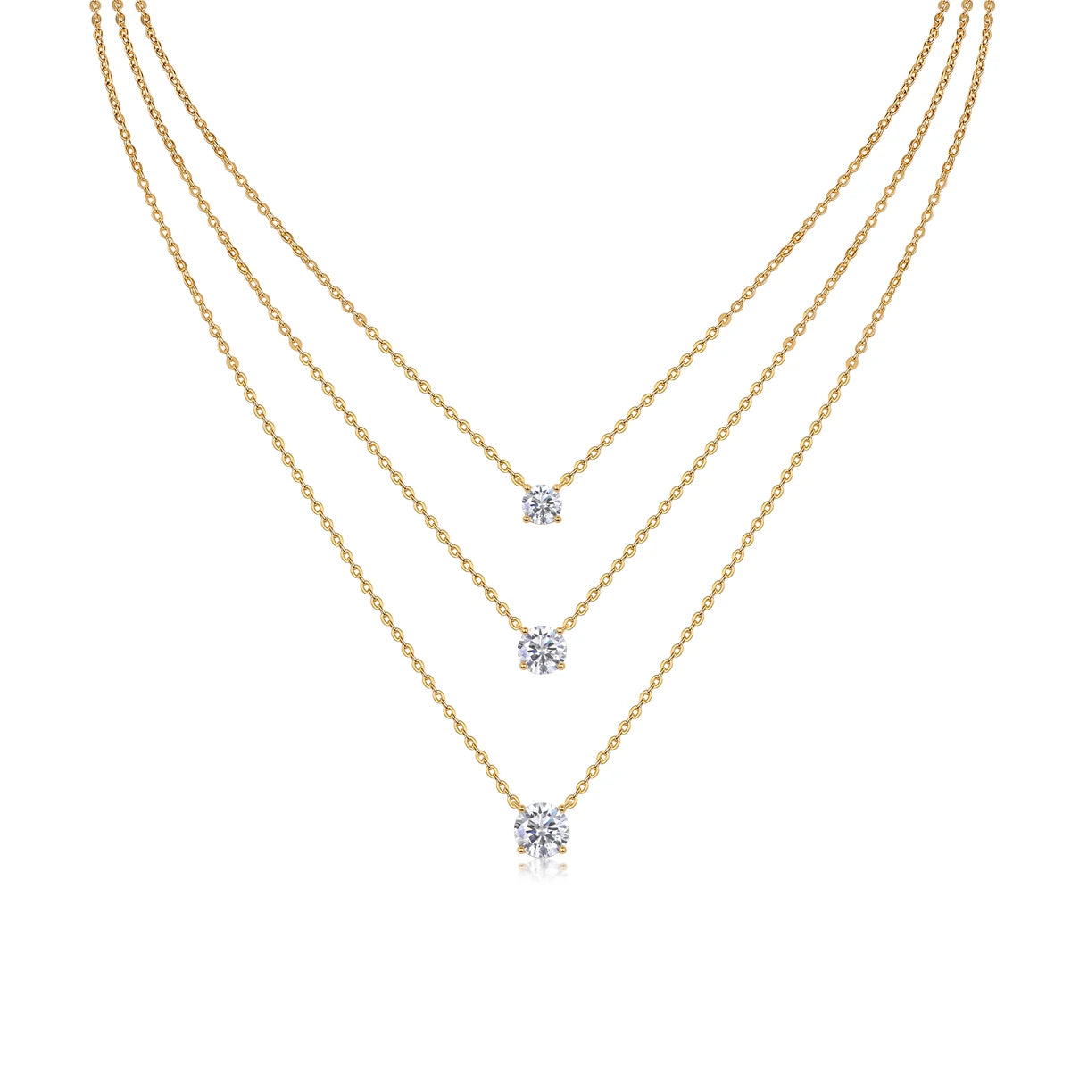 סט אלגנטי ומעודן של שלוש שרשראות בשכבות, כל אחת משובצת אבן מוסונייט עדינה שמוסיפה ברק נקי ומאוזן.